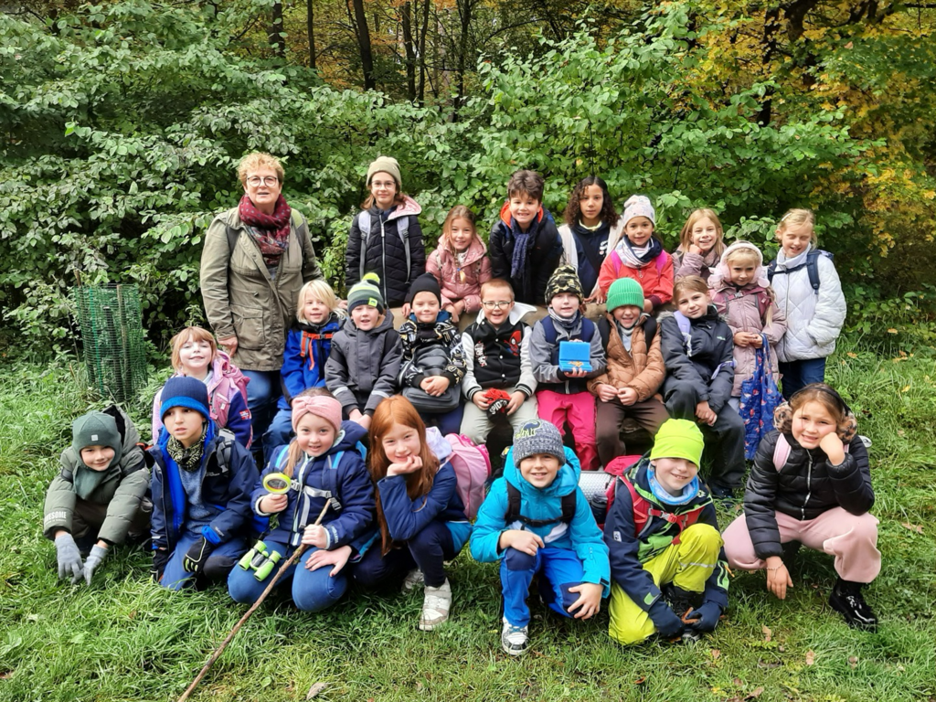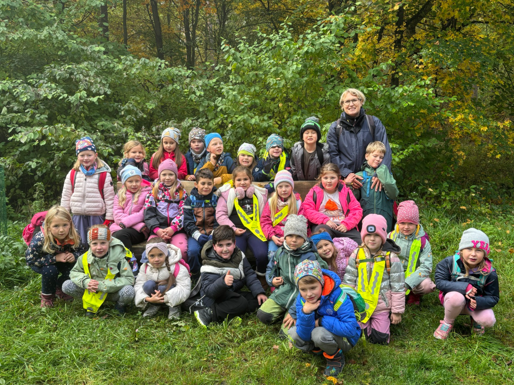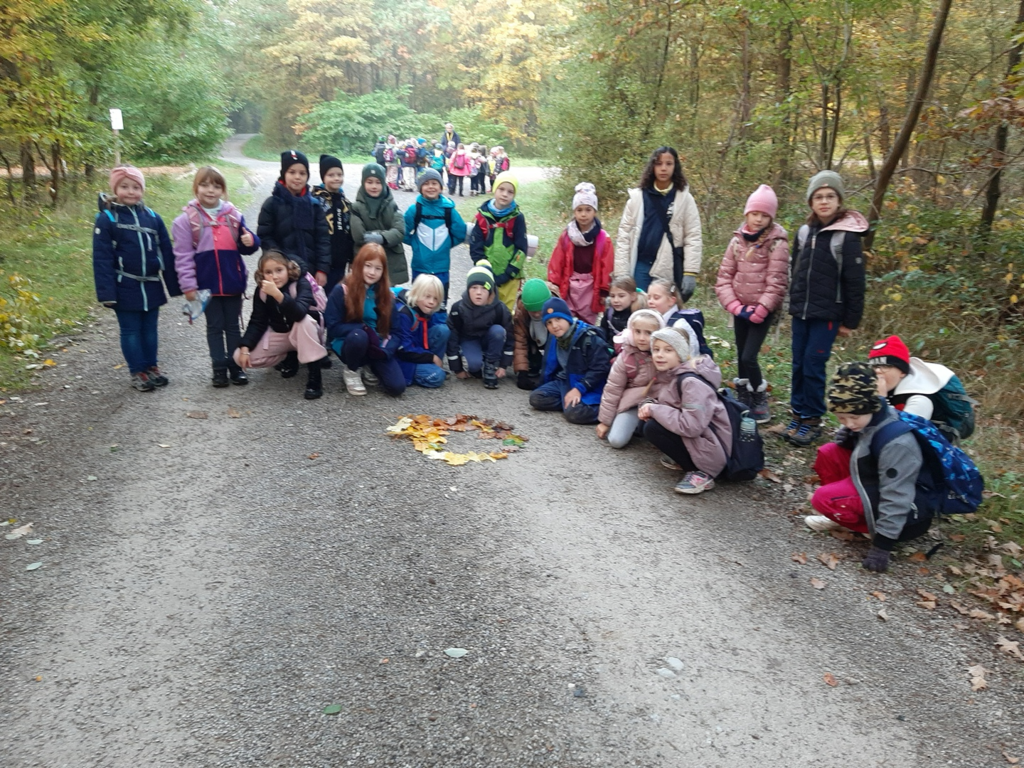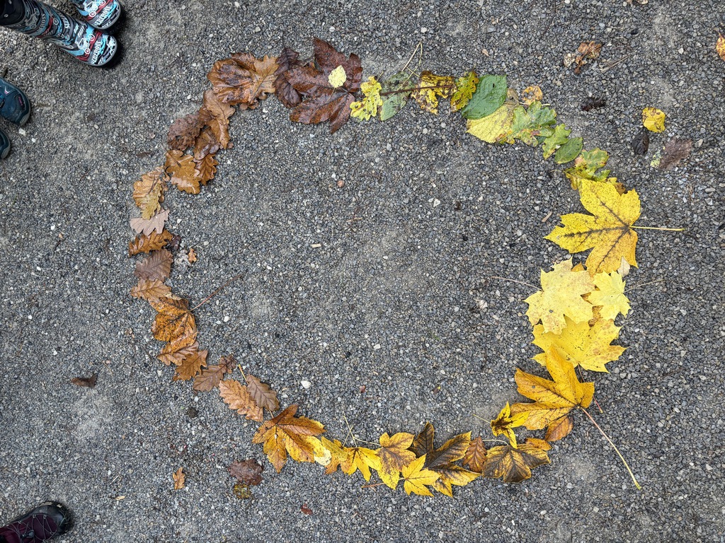 Gemeinsam wanderten die Klassen in den Schulwald. Auf dem Weg sammelte jedes Kind zwei schöne Herbstblätter. Jede Klasse legte mit den Blättern einen wunderschönen Farbkreis zum Herbst.