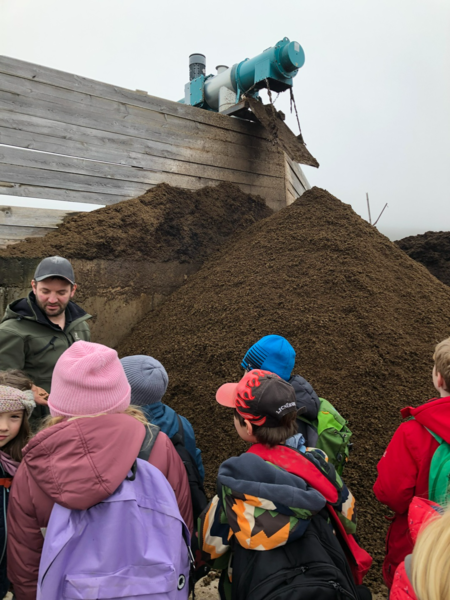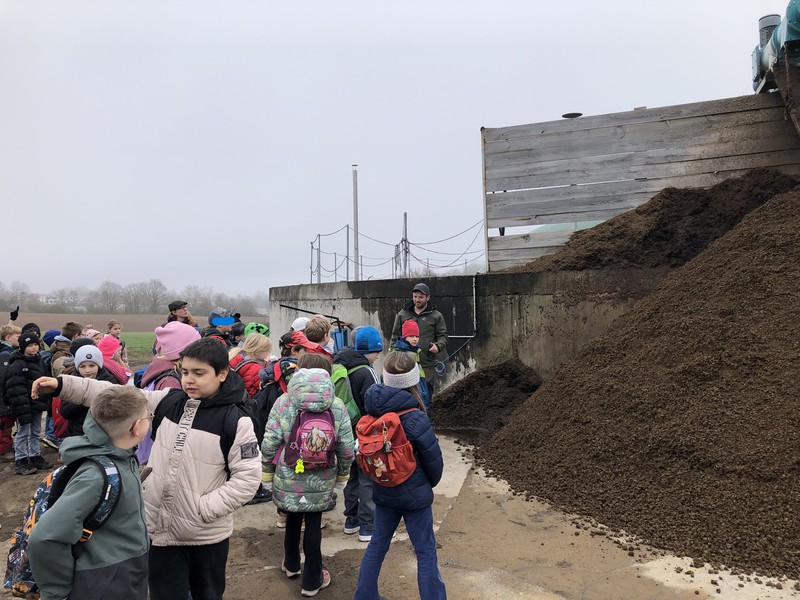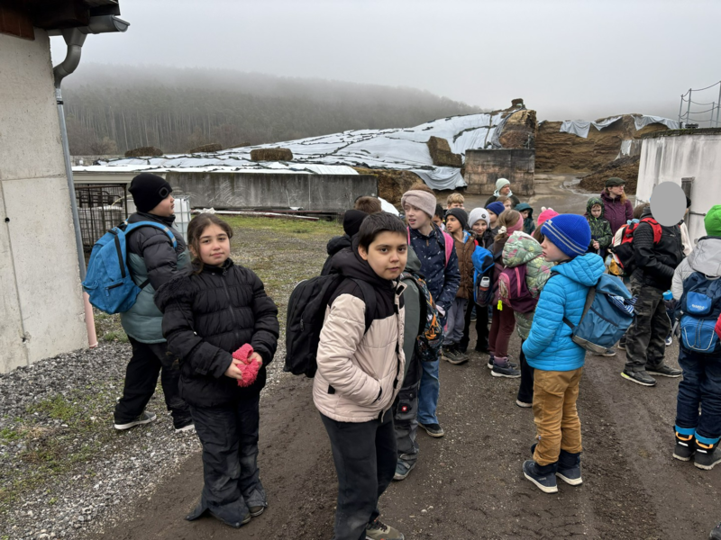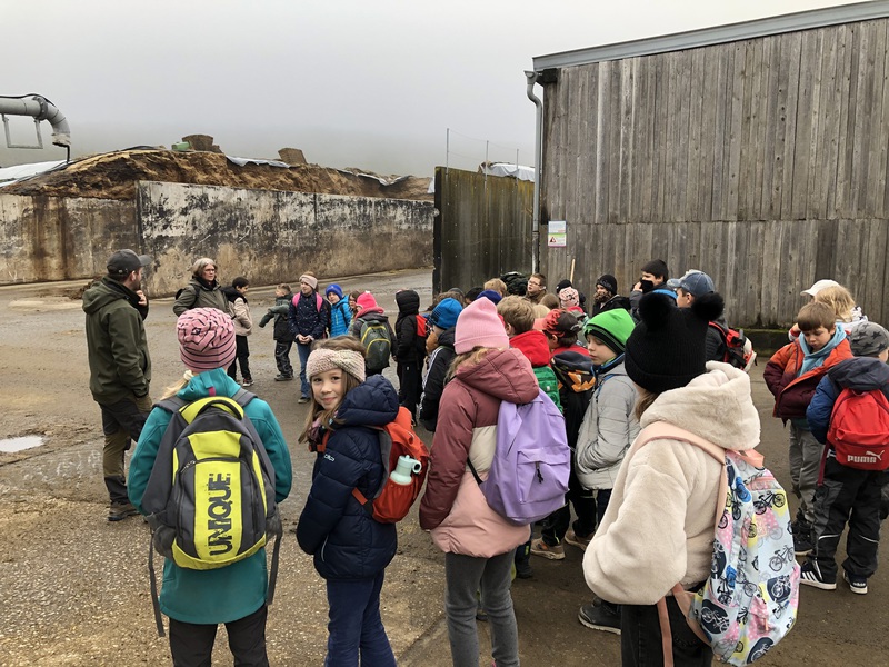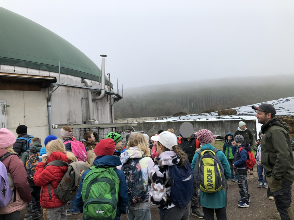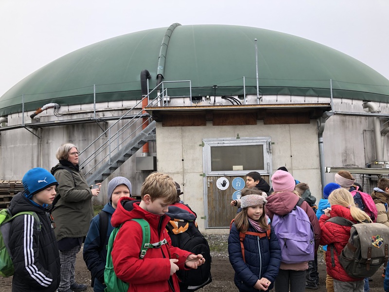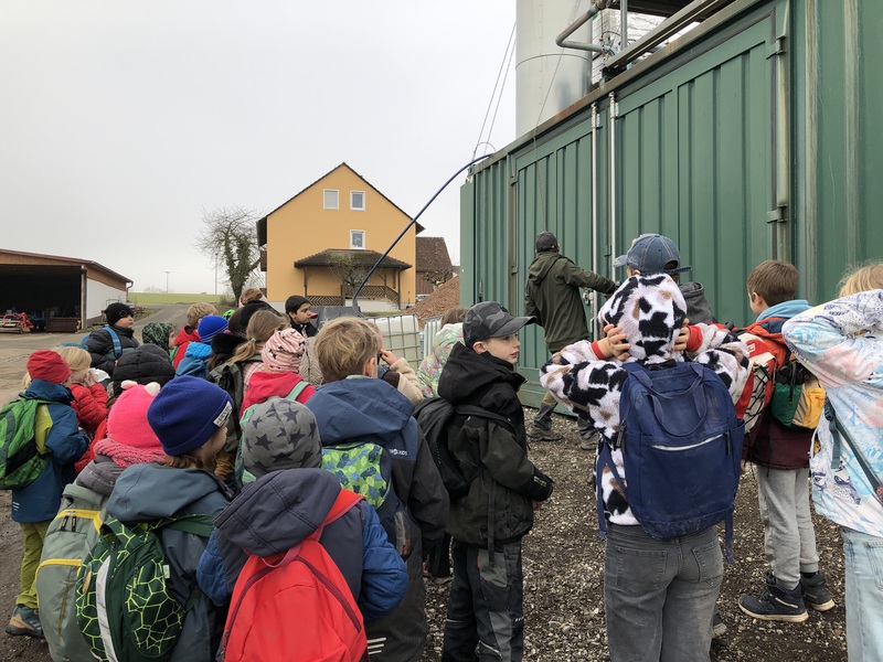 In Neuschauerberg angekommen, haben wir als erstes unsere Brotzeit gegessen. Währenddessen hat Herr Köhler uns Schweinefutter gezeigt, zum Beispiel Zuckerrüben und Getreide. Danach hat er uns gezeigt, wie die Ausscheidungen seiner Schweine aussehen. Das hat ganz schön gestunken! Uns wurde erklärt, wie die Biogasanlage funktioniert. In einer Biogasanlage wird aus Silage und Schweineausscheidungen Gas gewonnen, dass dann zur Energiegewinnung genutzt wird. Das, was am Ende übrig bleibt, stinkt gar nicht mehr und wird wieder als Dünger auf den Feldern verteilt. Das nennt sich Kreislauf. Bevor wird zurück zur Schule gegangen sind, gab es noch eine Süßigkeit.