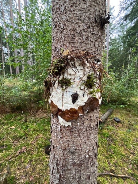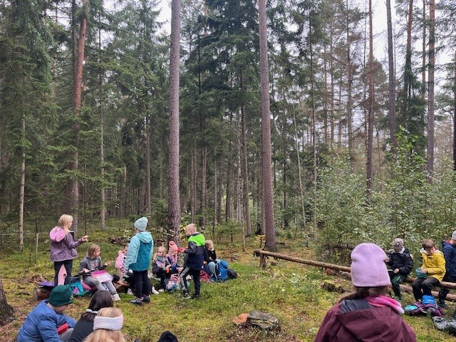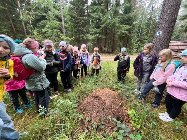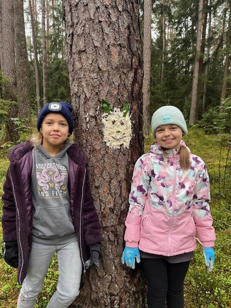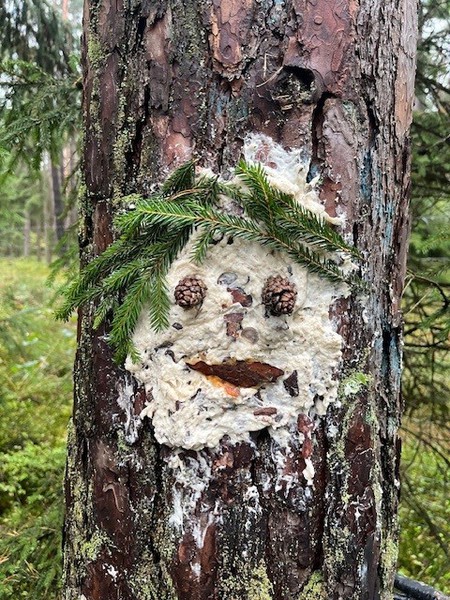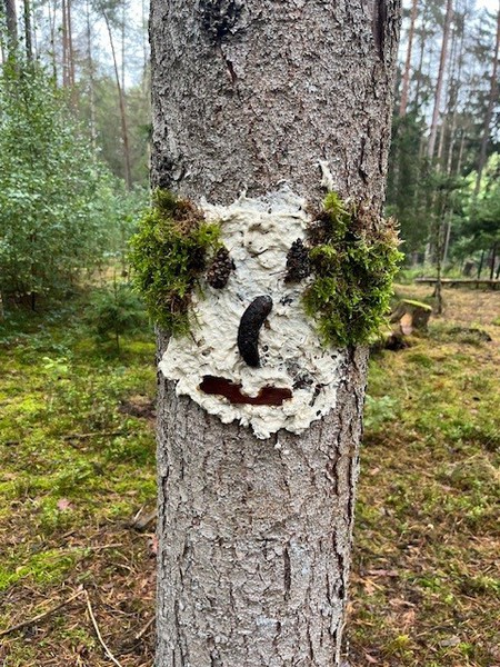Am Dienstag, den 7. Oktober 2025, besuchte die Klasse 4b gemeinsam mit ihrer Klassenlehrerin Frau Weiß und einer weiteren Begleitperson den Schulwald. Bei relativ gutem Wetter machten sich die Kinder zu Fuß auf den ca. 40 minütigen Weg. Unterwegs konnten viele bunte Blätter und Pilze bestaunt werden. Blätter, Eicheln und kleine Äste wurden gesammelt, um sie später zu bestimmen. Besonders spannend war es, die verschiedenen Rinden zu fühlen und Tiergeräusche zu hören. Sogar einen Ameisenhaufen gab es neben dem Wegesrand zu sehen. Im Schulwald angekommen wurde erst einmal eine längere Frühstückspause im Sitzkreis auf den Holzstämmen gemacht. Anschließend durfte jeder das Schulwaldgrundstück für sich erkunden. Nach einiger Zeit wurde sich wieder im Sitzkreis getroffen. Danach gestaltete jeder in einer Partnergruppe Baumgesichter. Ein Teig aus Wasser und Mehl wurde dabei an einen Baumstamm gedrückt und mit verschiedenen Waldmaterialien verziert. Es entstanden ganz unterschiedliche, interessante Werke.