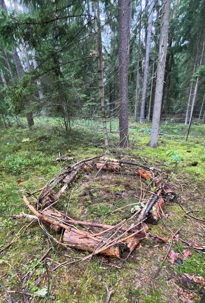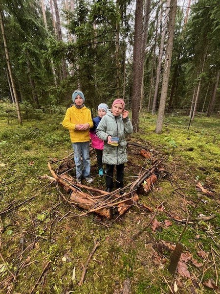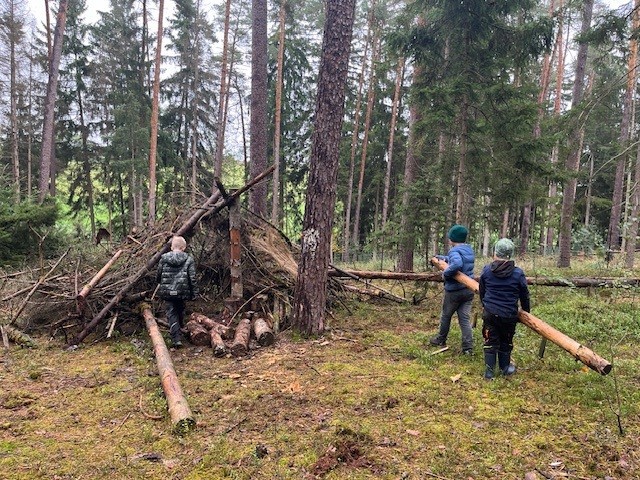 Zum Schluss wurde versucht den Schulwald noch etwas „Aufzuräumen“ indem heruntergefallenen Äste beiseite geräumt und in die Tippis weiterverbaut wurden. Zusätzlich entstand sogar ein kleines Sofa. Mit dabei war natürlich auch das Klassentier der 4b.
