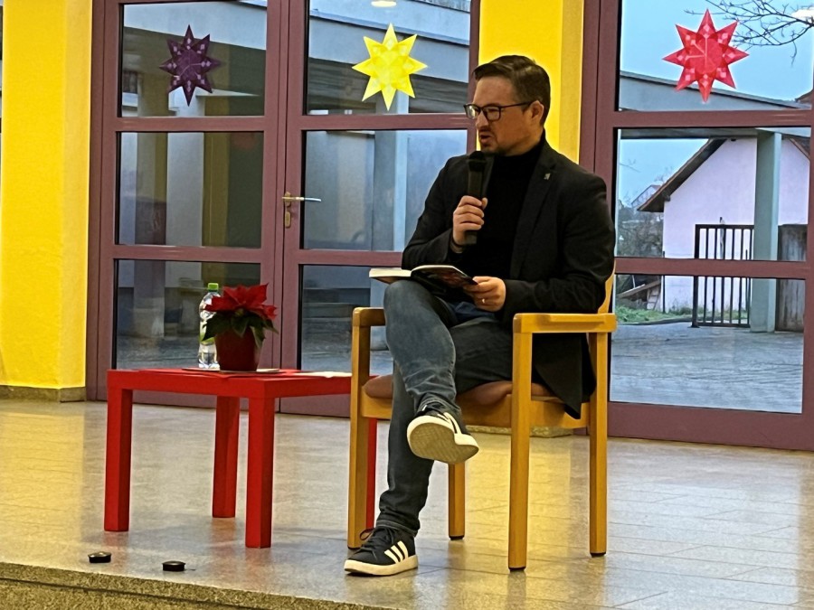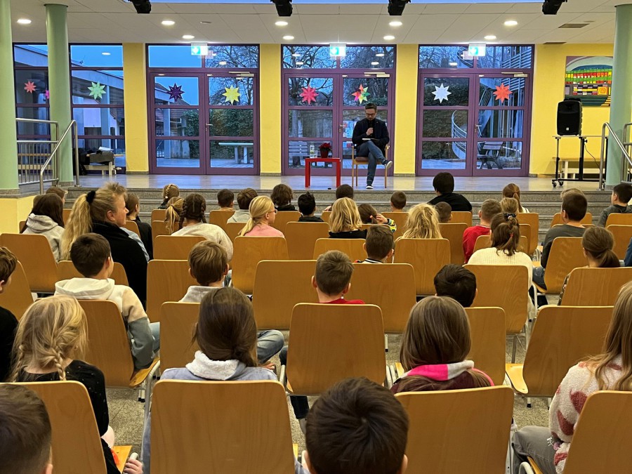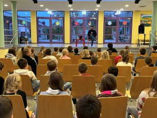 Mit viel Gefühl und einer ruhigen Lesestimme trug Stieglitz aus dem beliebten Kinderbuch „Hinter verzauberten Fenstern“ von Cornelia Funke vor. Die Schülerinnen und Schüler lauschten aufmerksam, ließen sich in die magische Adventskalenderwelt entführen und bedankten sich mit kräftigem Applaus.